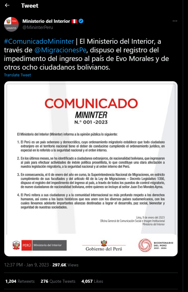 El Ministerio del Interior confirmó la noticia a través de un comunicado. “La Superintendencia Nacional de Migraciones dispuso el registro del impedimento del ingreso al país, a través de todos los puestos de control migratorio, de nueve ciudadanos de nacionalidad boliviana, entre quienes se incluye al señor Juan Evo Morales Ayma“.