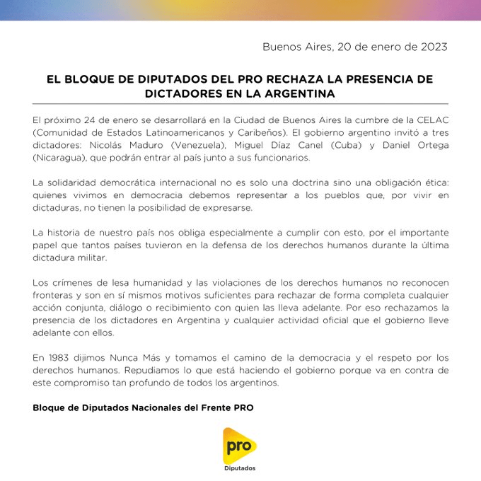 El comunicado expresa: “El gobierno argentino invitó a tres dictadores: Nicolás Maduro (Venezuela), Miguel Díaz Canel (Cuba) y Daniel Ortega (Nicaragua), que podrán entrar al país junto a sus funcionarios”. El repudio del PRO se suma al manifestado por Foro Argentino por la Democracia por la Región (FADER).