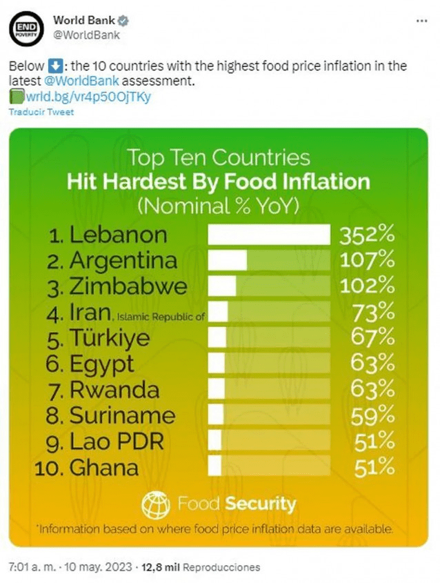 En cuanto a la situación de Argentina, el país es el único de América Latina que se encuentra en el top ten de las naciones más golpeadas por la inflación de los alimentos, con un 107%. El informe aclaró que Venezuela no forma parte del relevamiento porque el organismo utiliza estadísticas de aquellos países que cuentan con datos disponibles.
