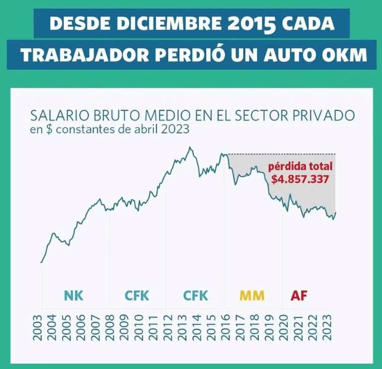 En contraste, durante el primer mandato de Cristina Kirchner, los trabajadores experimentaron ganancias salariales de $437.136, y de $497.881 durante su segundo mandato. Durante los primeros 40 meses de la gestión de Néstor Kirchner, hubo una ganancia salarial de $1.562.751.