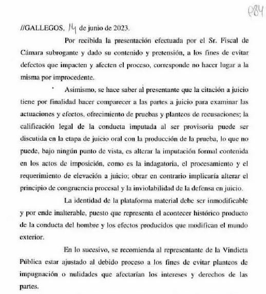 En respuesta al pedido de Heinz, el juez de la causa, Joaquín Cabral, dictaminó que debido al contenido y pretensión de la presentación del fiscal, no procedía su solicitud por ser improcedente. Además, recomendó al representante de la Fiscalía cumplir con el debido proceso para evitar impugnaciones o nulidades que puedan afectar los intereses y derechos de las partes involucradas.