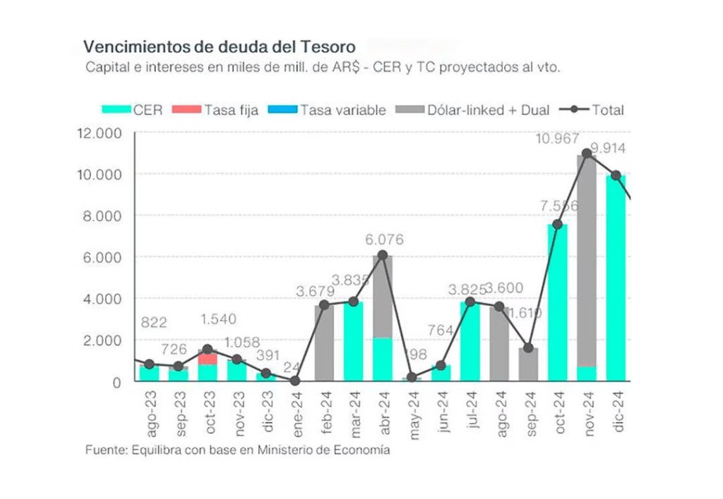 En 2024, el próximo gobierno enfrentará vencimientos de deuda significativos, especialmente en febrero y abril, por un total de $13,5 billones (unos USD 47.300 millones al tipo de cambio oficial actual) y entre octubre y diciembre por $28,4 billones (unos USD 100.000 millones). Estos vencimientos estarán vinculados a la inflación y la variación del dólar.