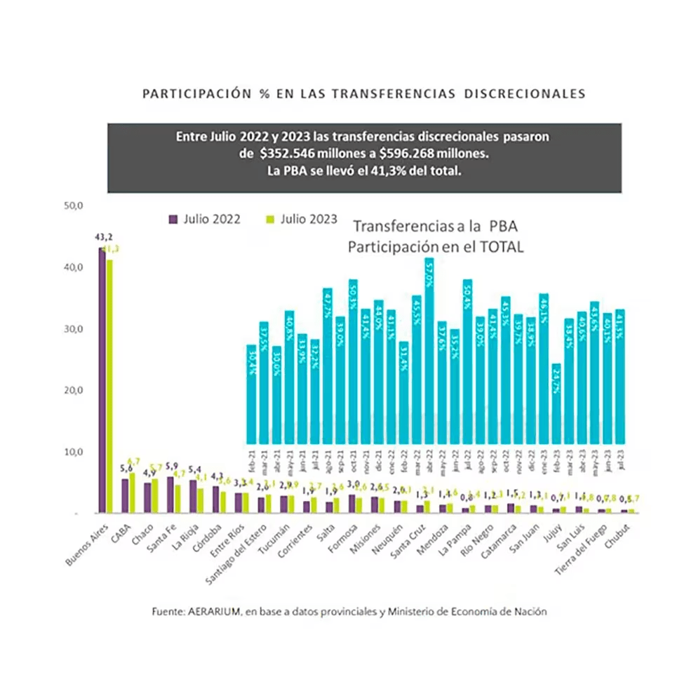 La distribución de los fondos discrecionales también ha estado sesgada a favor de las provincias afines al gobierno central. En julio, las transferencias discrecionales aumentaron un 56% interanual, lo que significó una caída real del 27.6%. Además, la distribución de los llamados «Adelantos del Tesoro Nacional» muestra un claro favoritismo político hacia las provincias oficialistas. La mayoría de estos fondos fue a parar a provincias gobernadas por el mismo partido político que el gobierno nacional.