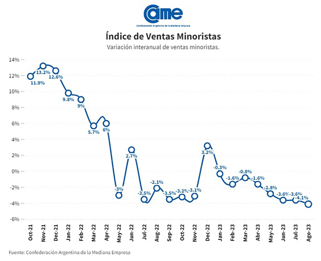 Las ventas minoristas en Argentina continuaron cayendo en agosto, marcando ocho meses consecutivos de retroceso interanual en 2023. La Confederación Argentina de la Mediana Empresa (CAME) informó que en agosto, la caída de las ventas minoristas fue del 4,1% interanual, siendo la cifra más baja del año hasta la fecha.