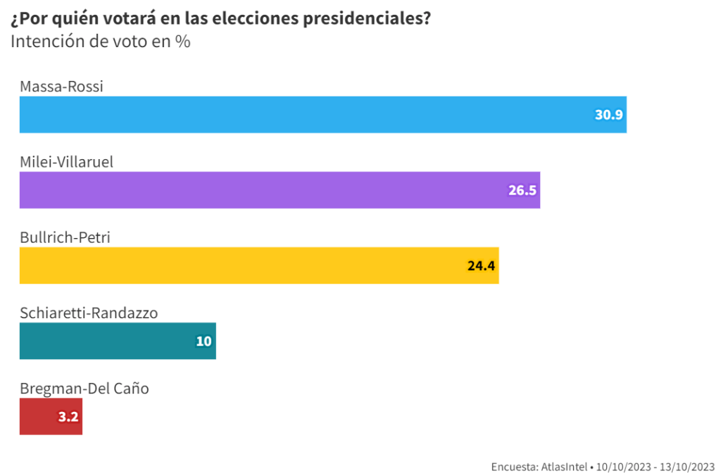 Según la última encuesta de la consultora AtlasIntel, publicada por CNN, el candidato presidencial de Unión por la Patria, Sergio Massa, lidera las intenciones de voto para las elecciones del próximo domingo con un 30,9%, seguido por Javier Milei de La Libertad Avanza con el 26,5%, y Patricia Bullrich de Juntos por el Cambio con el 24,4%.