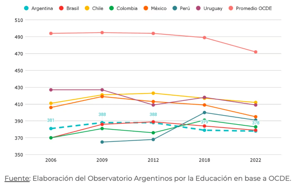 En las pruebas PISA 2022, Argentina reveló resultados desalentadores. En Matemática, los estudiantes argentinos obtuvieron 378 puntos, ubicándose muy por debajo del promedio de la OCDE y en el puesto 66 de 81 países. En Lectura, el puntaje fue de 401 puntos, también por debajo del promedio y en el puesto 58, mientras que en Ciencias lograron 406 puntos, ubicándose en el puesto 60. Estas cifras reflejan que un alto porcentaje de estudiantes se sitúa por debajo del nivel mínimo en estas materias: el 72,9% en Matemática, el 54,4% en Lectura y el 53,9% en Ciencias.