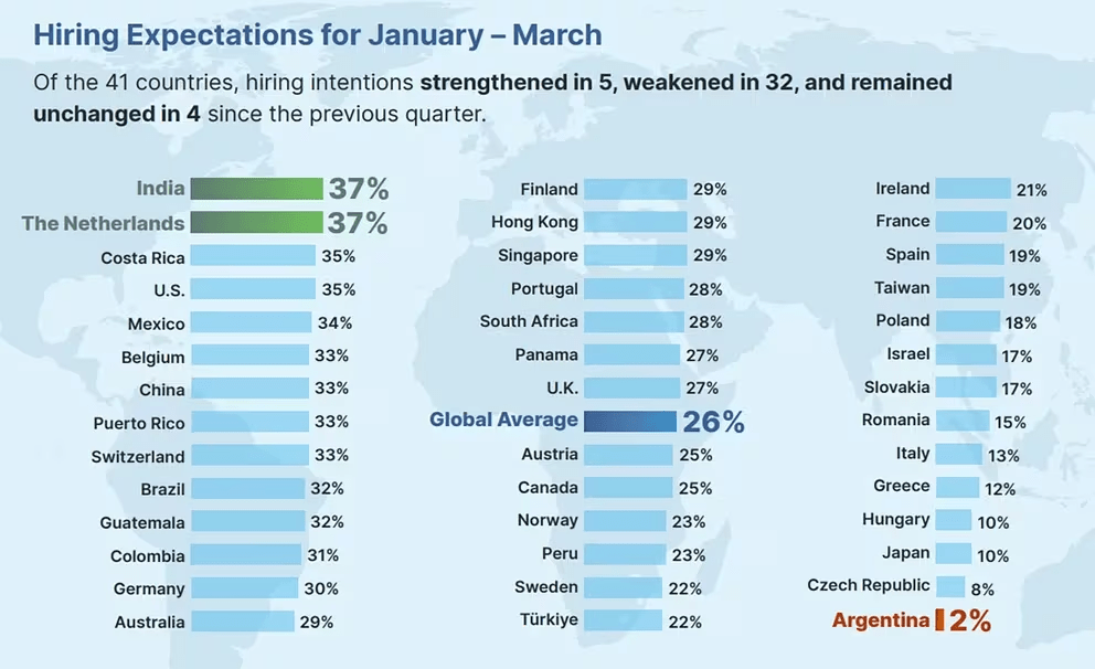 A pesar de este modesto resultado positivo, la comparación con otros países de América muestra una gran brecha. Mientras que países como Costa Rica y Estados Unidos proyectan expectativas mucho más altas de contratación (+35% y +34% respectivamente), Argentina tiene las expectativas más débiles de la región con un +2%.