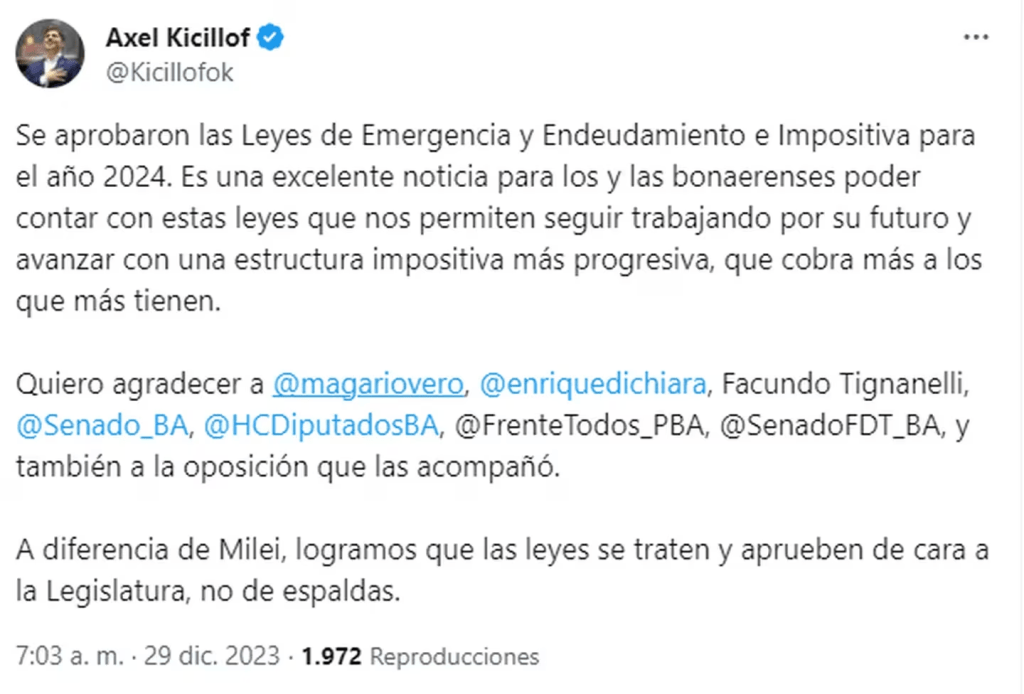 Tras la sanción, Kicillof agradeció a la oposición por su apoyo, destacando la aprobación democrática de las leyes, en contraste con críticas de otros sectores que cuestionaron la expansión estatal frente al esfuerzo fiscal de los contribuyentes.
