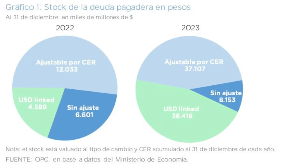 La deuda ajustada al dólar oficial creció del 19.75% al 45.9%, mientras que la deuda con ajuste por inflación bajó del 51.8% al 44.3%. El Gobierno considera opciones para manejar los compromisos de deuda en pesos, buscando soluciones para evitar presiones financieras.