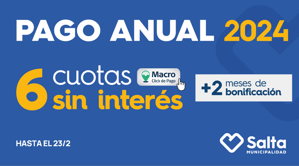 La Municipalidad de Salta implementará el Pago Anual de Tributos Municipales 2024 a partir del 15 de enero, ofreciendo beneficios a los vecinos que realicen pagos anticipados de impuestos municipales. Los contribuyentes que paguen por adelantado recibirán una bonificación equivalente a dos meses y podrán optar por realizar el pago en 6 cuotas sin interés a través de Macro Click de Pago. El programa se aplica a diversos tributos, como el Impuesto Inmobiliario, Tasa General de Inmuebles, Impuesto Automotor, entre otros.