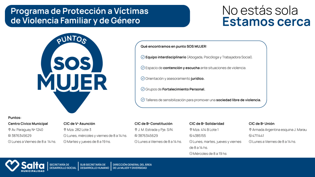 La Municipalidad de Salta ha implementado el Programa de Protección a Víctimas de Violencia Familiar y de Género a través de diferentes puntos denominados «SOS Mujer» en varias zonas de la ciudad. En estos lugares, se proporciona asistencia a vecinos y vecinas a través de un equipo interdisciplinario compuesto por abogadas, psicólogas y trabajadoras sociales. Los servicios ofrecidos incluyen espacios de contención y escucha, asesoramiento jurídico, grupos de fortalecimiento personal y talleres de sensibilización para fomentar una sociedad libre de violencia.