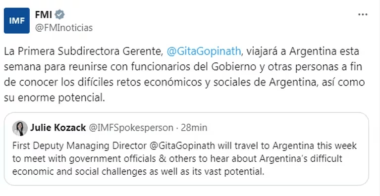 Este viaje fue confirmado por la vocera del organismo, Julie Kozack, quien mencionó que Gopinath se encontrará con funcionarios gubernamentales y representantes de la sociedad civil para abordar los desafíos económicos y sociales de Argentina, así como su potencial. Gopinath, una economista y académica de origen indio-estadounidense, es la subdirectora general del FMI y colabora estrechamente con Kristalina Georgieva, directora gerente del FMI. Esta será su primera visita a Argentina, y su llegada se produce en un momento en el que el país busca cumplir con compromisos económicos desafiantes, como alcanzar un superávit primario del 2% del PBI. Respecto a las negociaciones con el FMI, después de la séptima revisión del acuerdo, Argentina recibió un desembolso de US$4700 millones, totalizando US$40.600 millones desde el inicio del programa. El programa de desembolsos para 2024 suma más de US$6500 millones, pero a partir de 2025 no se prevén más giros por parte del FMI.