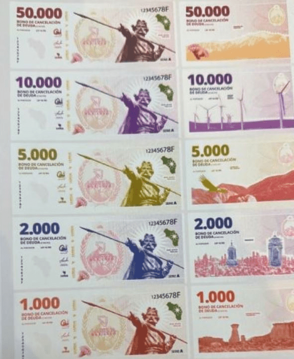 Los billetes tendrán denominaciones de 1000, 2000, 5000, 10.000 y 50.000 pesos, todos ellos con la imagen de Ángel Vicente “Chacho” Peñaloza, un líder federal del siglo XIX. Quintela indicó que la emisión física del bono se realizará en aproximadamente 45 días y luego se definirá el porcentaje de salario que se abonará en bonos.