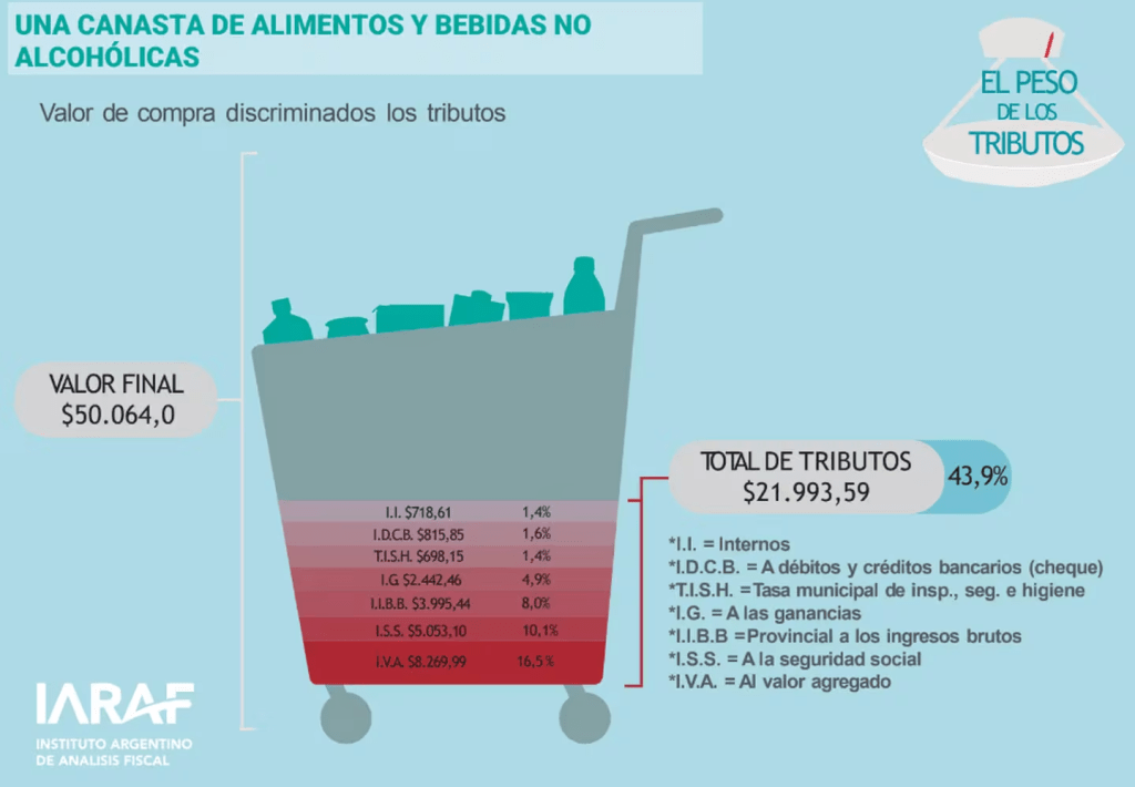 El informe del Instituto Argentino de Análisis Fiscal (IARAF) revela que los impuestos representan el 43,9% del precio final de los alimentos de consumo masivo.