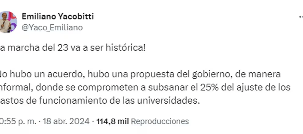 Emiliano Yacobitti, vicerrector de la UBA, convocó a la marcha de mañana y desmintió que hubiera acuerdo con el Gobierno