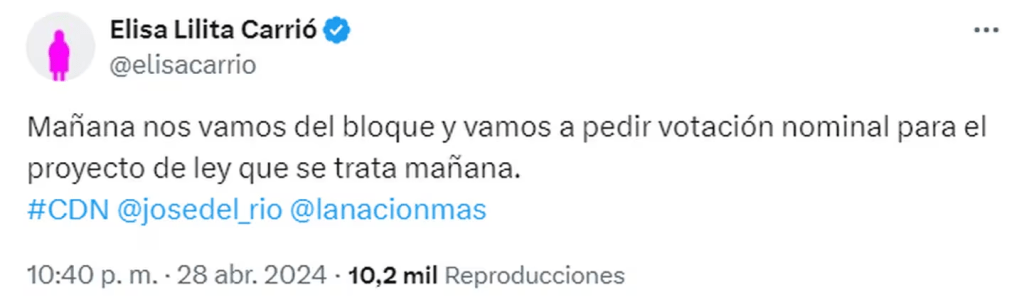 Esto se produce en la previa del segundo debate por la aprobación de la Ley Ómnibus en Diputados que arrancará este lunes al mediodía. Carrió expresó que solicitarán votación nominal para el proyecto y detalló que la decisión se debe a diferencias ideológicas con sectores representados en dicho bloque.