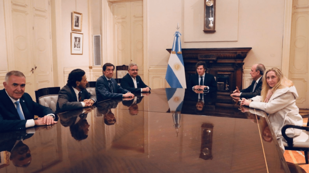 El presidente Javier Milei se reunió en Casa Rosada con los gobernadores de Salta, Gustavo Sáenz; de Catamarca, Raúl Jalil; de Jujuy, Carlos Sadir; y de Tucumán, Osvaldo Jaldo. En este encuentro, Gustavo Sáenz entregó al presidente el Pacto de Güemes, junto con propuestas sobre el nuevo régimen de coparticipación federal de impuestos y el proyecto del Corredor Bioceánico.