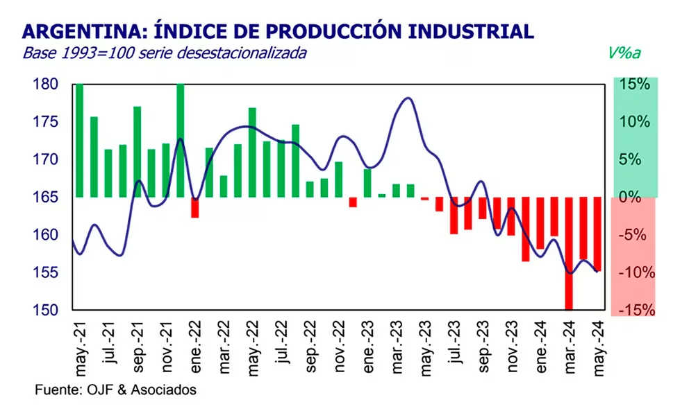 Fundación FIEL también reportó una caída interanual del 10,9% en mayo, aunque registró una leve recuperación mensual del 1%. La industria podría experimentar frenos en plantas y turnos en los próximos meses, lo que ralentizaría aún más cualquier posible recuperación cíclica.