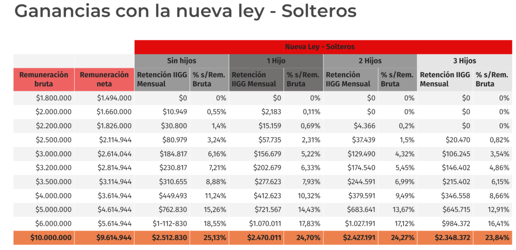 La ley establece nuevos mínimos no imponibles: $1.800.000 brutos para solteros y $2.200.000 para casados con hijos. Por ejemplo, un empleado soltero con dos hijos menores de 18 años comenzará a tributar a partir de un salario bruto de $2.100.000, lo que equivale a un sueldo neto de $1.781.277,39. En el caso de un empleado casado con dos hijos menores a cargo, quedará eximido del impuesto si su salario bruto es inferior a $2.400.000, es decir, un sueldo neto de $2.081.277,39.