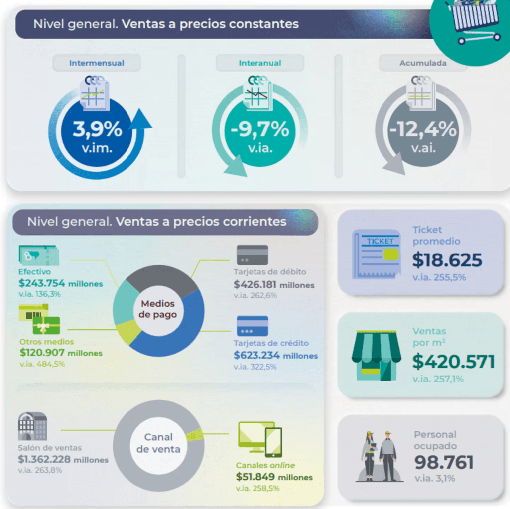 En mayo de 2024, las ventas en supermercados en Argentina continuaron su tendencia descendente, registrando una caída del 9,7% en comparación con el mismo mes del año anterior. Esta disminución marca el séptimo mes consecutivo de baja en las ventas, acumulando una caída del 12,4% en lo que va del año. A pesar de un aumento del 3,9% respecto al mes anterior, el retroceso acumulado en el primer semestre del año sigue siendo significativo.