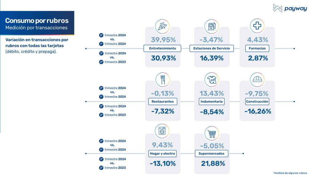 El índice Payway también revela la evolución de las ventas con tarjeta por rubros. El entretenimiento creció un 40% en el segundo trimestre comparado con el primero, y la indumentaria aumentó un 13,43%. En contraste, sectores como la construcción y los supermercados experimentaron caídas del 9,75% y 5,05% respectivamente.