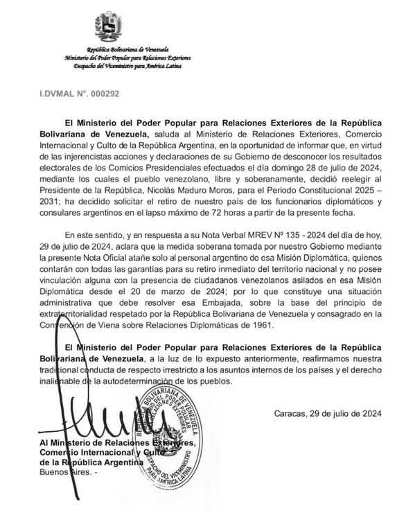 El 29 de julio de 2024, Venezuela emitió un comunicado oficial exigiendo a la Argentina y a otros seis países que retiren a sus diplomáticos en un plazo de 72 horas.