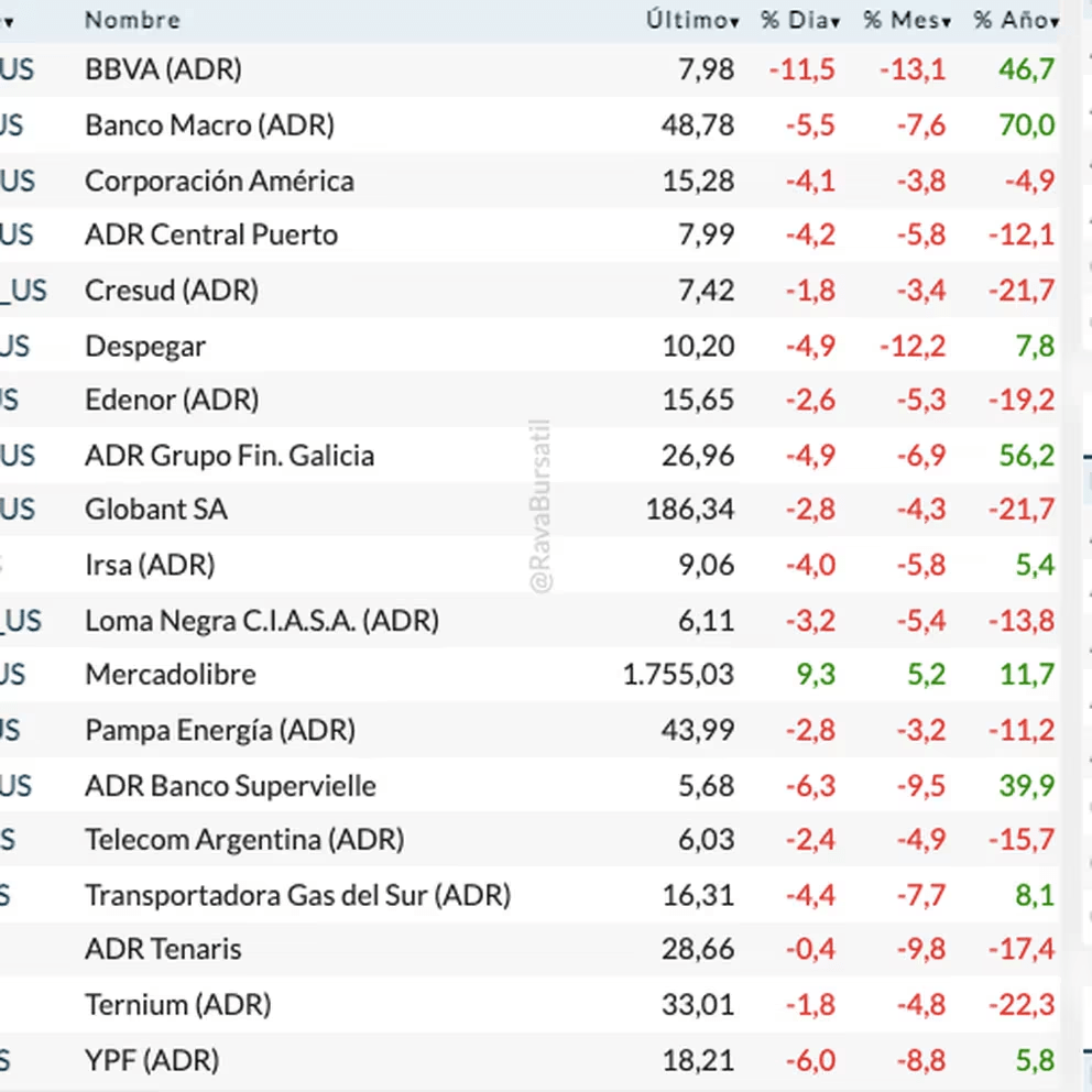 Entre las acciones argentinas que se cotizan en dólares en Nueva York, las caídas fueron notables, alcanzando hasta un 11,5% en algunos casos, como en el Banco Francés y Grupo Supervielle. Sin embargo, Mercado Libre destacó con un aumento del 9,3% tras reportar resultados trimestrales positivos.