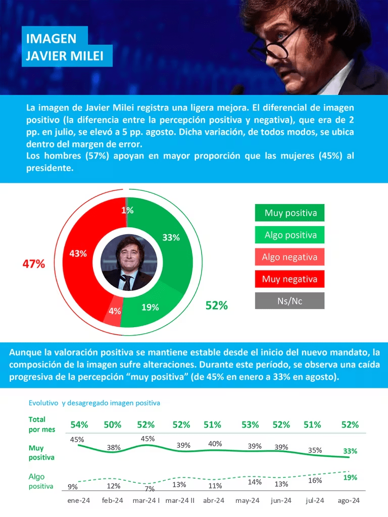 La imagen del presidente Milei ha mejorado ligeramente, con un diferencial positivo de 5 puntos porcentuales en agosto, frente a los 2 puntos de julio. Sin embargo, la percepción «muy positiva» de su gestión ha disminuido del 45% en enero al 33% en agosto, mientras que la percepción «algo positiva» se ha mantenido en un 19%. El presidente cuenta con un mayor respaldo entre los hombres (57%) que entre las mujeres (45%).