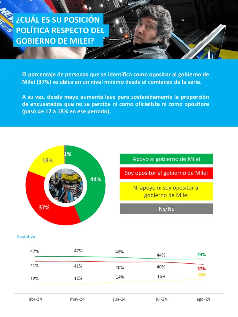 Según un reciente sondeo de la consultora Opina Argentina, el Gobierno de Javier Milei mantiene un respaldo sólido en la opinión pública, a pesar de la lenta recuperación económica. Entre el 1 y el 5 de agosto, se encuestó a 1.189 personas de forma online, revelando que un 44% de los participantes apoya al Gobierno, una cifra estable que solo ha disminuido un 3% desde abril. En contraste, la oposición ha visto un leve descenso en su apoyo, bajando del 41% en abril al 37% en agosto. Además, ha aumentado el número de encuestados que no se identifican ni con el oficialismo ni con la oposición, pasando del 12% en mayo al 18% en agosto.