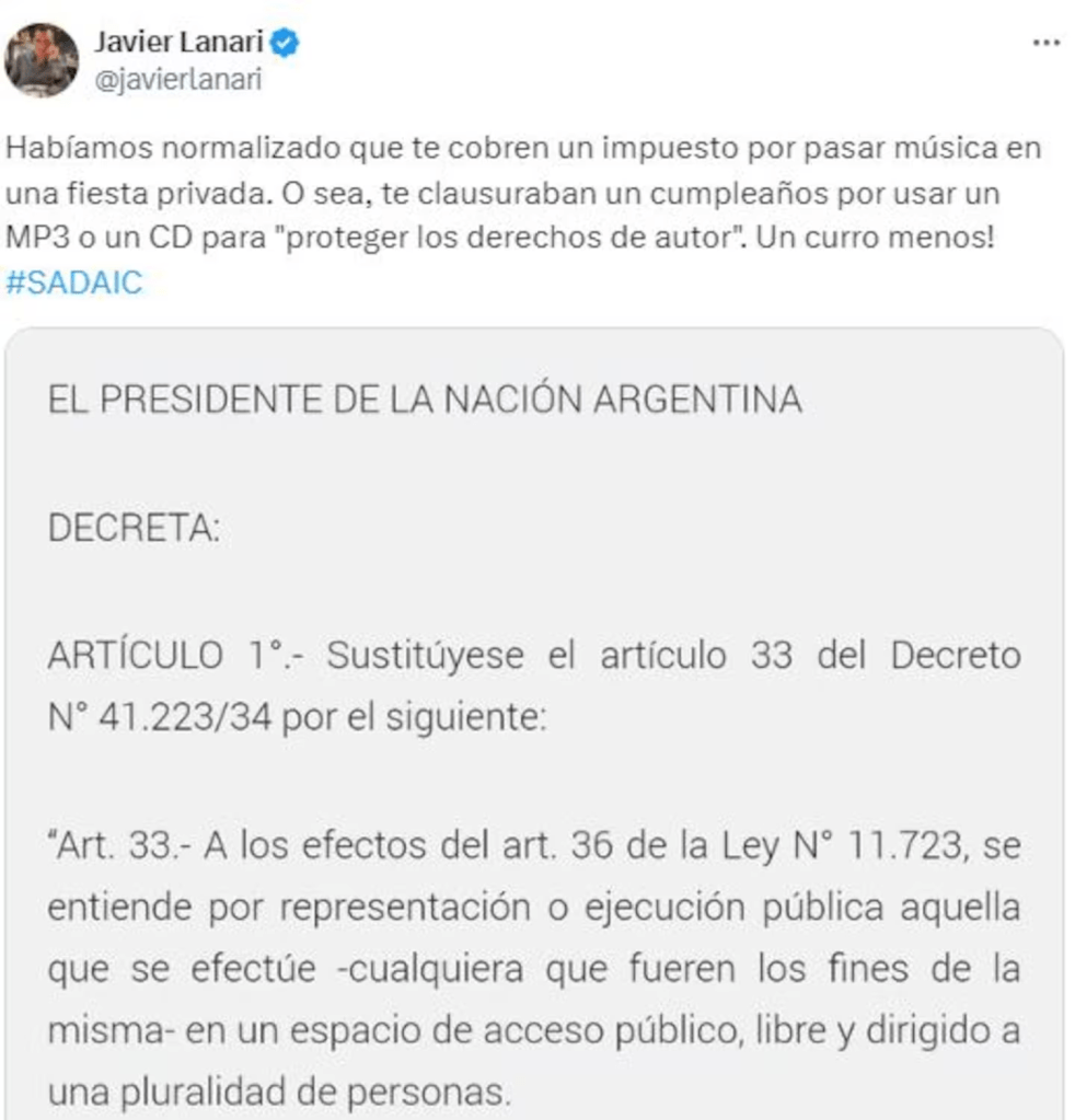 El Gobierno de Javier Milei eliminó el cobro de derechos de autor por parte de la Sociedad Argentina de Autores y Compositores de Música (SADAIC) en eventos de carácter privado, tanto en espacios de ocupación permanente como temporal, como los salones de fiestas. Esta medida, implementada a través del decreto 765/2024, responde a la modificación del Decreto N° 41.223 sobre propiedad intelectual y derechos de autor, que ahora incluye a internet como un nuevo espacio público que requiere autorización para la reproducción de obras.