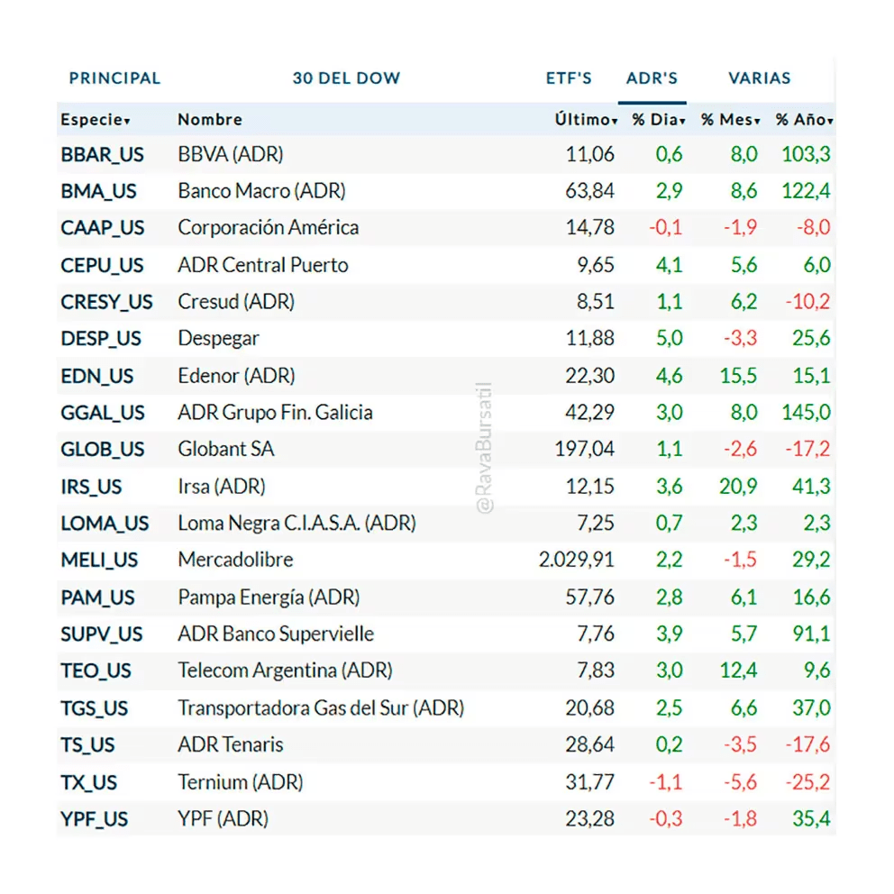 Las acciones argentinas que cotizan en Wall Street continúan su tendencia alcista y han alcanzado subas de hasta un 150% en dólares en lo que va del año, impulsadas por un clima más favorable en los mercados internacionales, la expansión del crédito y la baja de la inflación. El índice Merval, medido en dólares, también se encuentra en niveles máximos de los últimos años, llegando a los 1.400 dólares, aunque aún está por debajo de los 1.800 dólares que alcanzó en 2018.