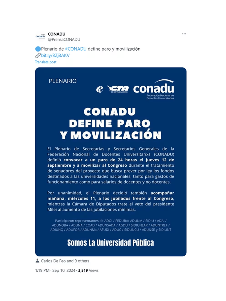 Docentes universitarios de la Universidad de Buenos Aires (UBA), en conjunto con la Federación Nacional de Docentes, Investigadores y Creadores Universitarios (Conadu), llevan adelante un nuevo paro de 48 horas y una movilización frente al Congreso, con el objetivo de exigir un financiamiento sostenido para las universidades nacionales y la recomposición salarial. La medida tiene lugar en el contexto del debate en el Senado sobre la Ley de Financiamiento Universitario, la cual ya fue aprobada por la Cámara de Diputados y que el Gobierno ha advertido que vetará, alegando que la ley implicaría déficit fiscal. El paro ha sido respaldado por la Confederación General del Trabajo (CGT) y las dos Centrales de Trabajadores Argentinos (CTA), que en una conferencia conjunta manifestaron su apoyo a los docentes.