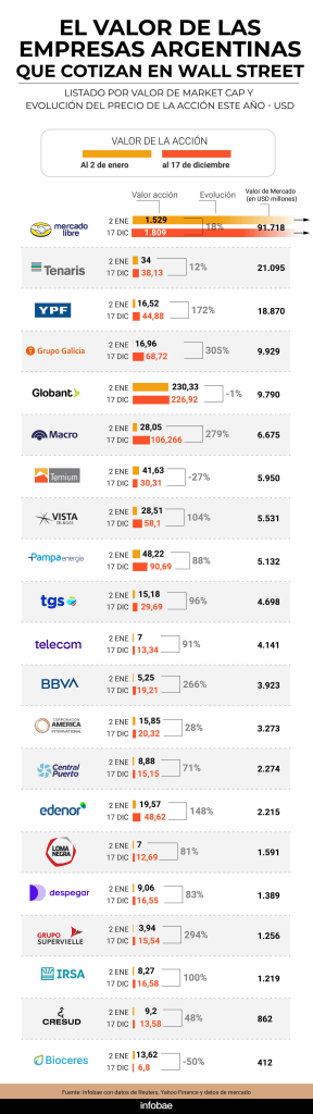 Mercado Libre se consolidó como la empresa argentina de mayor valor en los mercados internacionales, alcanzando una capitalización de USD 91.718 millones tras un aumento del 18% en sus acciones. Le siguió Tenaris, con un valor de mercado de USD 21.095 millones y un alza del 12% en el año. YPF, por su parte, tuvo un destacado desempeño en el sector energético, con una suba del 172% desde enero, lo que la posicionó como la empresa con mejor rendimiento en este rubro.