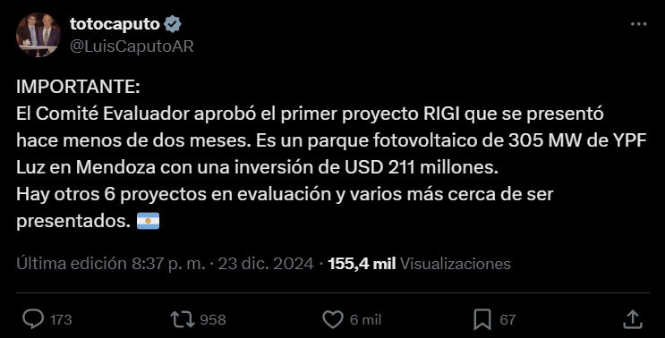 El ministro de Economía, Luis Caputo, confirmó que el Régimen de Incentivo a las Grandes Inversiones (RIGI), recientemente implementado, aprobó su primer proyecto. Se trata de un parque solar en El Quemado, Mendoza, desarrollado por YPF Luz junto a la Empresa Mendocina de Energía (Emesa), con una inversión de USD 211 millones. Este parque fotovoltaico tendrá una capacidad instalada de 305 MW, suficiente para abastecer a más de 233,000 hogares, y contribuirá a reducir emisiones de CO₂ en más de 385,000 toneladas al año.