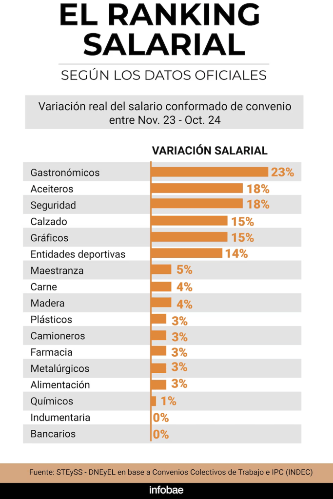 El 2024 estuvo marcado por una fuerte dispersión salarial entre los sectores. Según datos del Ministerio de Trabajo, mientras algunos gremios superaron ampliamente la inflación (como Gastronómicos con un 23% de mejora real), otros apenas la igualaron o quedaron rezagados. El salario medio real en el sector privado mostró recuperación en octubre, superando niveles previos a la devaluación de diciembre de 2023, mientras que el sector público experimentó una caída más pronunciada.