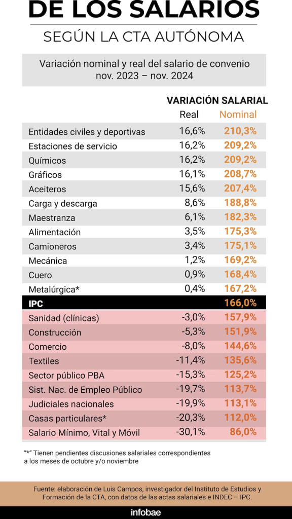 El investigador Luis Campos de la CTA Autónoma destacó que esta dispersión fue característica del año, con sectores privados registrando incrementos reales desiguales, mientras el sector público mantuvo una tendencia general de retroceso. Además, señaló que las diferencias entre sectores privados y públicos se profundizaron, con algunos logrando una recuperación rápida y otros quedando relegados.