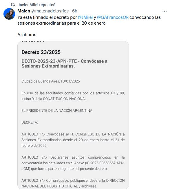El Gobierno formalizó el llamado a sesiones extraordinarias mediante su publicación en el Boletín Oficial, estableciendo que el Congreso funcionará entre el 20 de enero y el 21 de febrero de 2025. El presidente Javier Milei confirmó la medida con un mensaje en su cuenta de X: «A laburar».