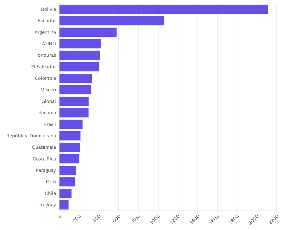 Venezuela lidera con el riesgo más alto del hemisferio: 23,459 puntos básicos, reflejando crisis económica, devaluación e inestabilidad política. Bolivia ocupa el segundo lugar con 2,111 puntos, seguida por Ecuador (1,061 puntos). Argentina, históricamente problemática en términos de deuda externa, registra 579 puntos, siendo el cuarto país con mayor riesgo.