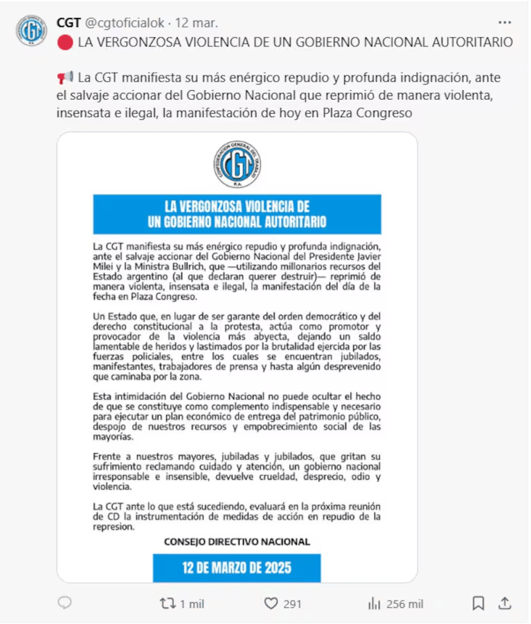 El anuncio fue realizado por Héctor Daer durante el Congreso Nacional de la Unión de Trabajadores de la Economía Popular (UTEP). La medida surge tras los incidentes ocurridos en una manifestación de jubilados y clubes de fútbol en las inmediaciones del Congreso, donde la represión policial dejó heridos, incluyendo al fotoperiodista Pablo Grillo, quien se encuentra en estado crítico. La CGT responsabilizó directamente a Milei y a la ministra de Seguridad, Patricia Bullrich, expresando su “profunda indignación”.