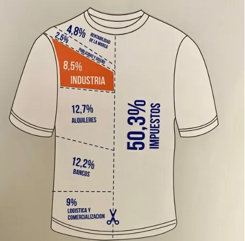 El informe de la Fundación Pro Tejer revela que el 75% del precio final de una prenda está vinculado a impuestos y costos ajenos a la producción. Solo un 8,5% corresponde a costos industriales y la rentabilidad de los fabricantes es de apenas 4,8%. La carga impositiva representa un 50,3% del precio de una prenda, con tributos nacionales, provinciales y municipales, incluyendo doble tributación de Ingresos Brutos.