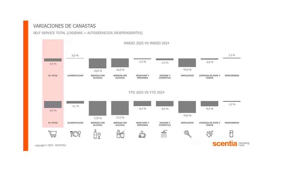 El consumo masivo en Argentina cayó un 5,4% interanual en marzo de 2025 y acumula un descenso del 8,6% en el primer trimestre del año, según datos de la consultora Scentia. Con estos resultados, el sector registra 16 meses consecutivos de retracción, a pesar de contar con una baja base de comparación por el mal desempeño de 2024 y algunos signos de mejora en la actividad económica general.