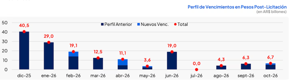 Tras la última licitación de noviembre, el Gobierno deberá afrontar en diciembre vencimientos en pesos por $40 billones, que se concentrarán en una única subasta. Aunque buena parte de esos compromisos está en manos del sector público —lo que permite canjes internos para aliviar el calendario— el mes sigue siendo crítico debido a la limitada disponibilidad de caja del Tesoro.