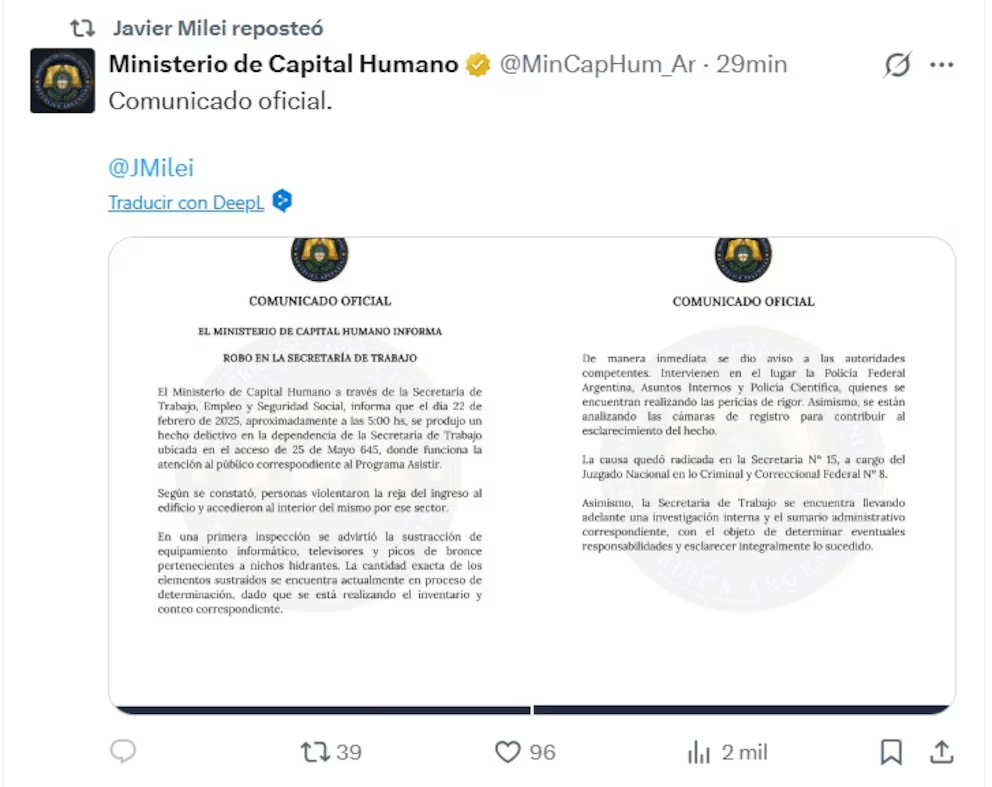 Un robo ocurrido en la madrugada del domingo en la Secretaría de Trabajo generó preocupación en el Gobierno nacional. El Ministerio de Capital Humano confirmó que personas no identificadas ingresaron al edificio ubicado en 25 de Mayo 645, en el microcentro porteño, donde funciona la atención del Programa Asistir, a pocas cuadras de la Casa Rosada.